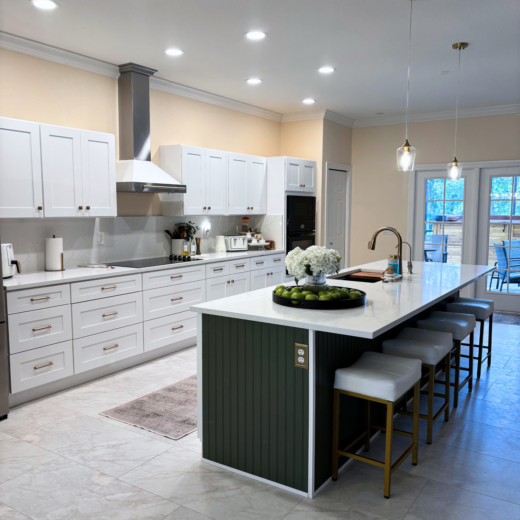 Ideally, a single metal finish would have been used throughout the kitchen. However, as often happens in real flip projects, budget limitations made that approach unrealistic. To maintain cohesion, I strategically selected a range hood that incorporated multiple finishes, allowing the mixed metals to feel intentional and visually balanced rather than mismatched.